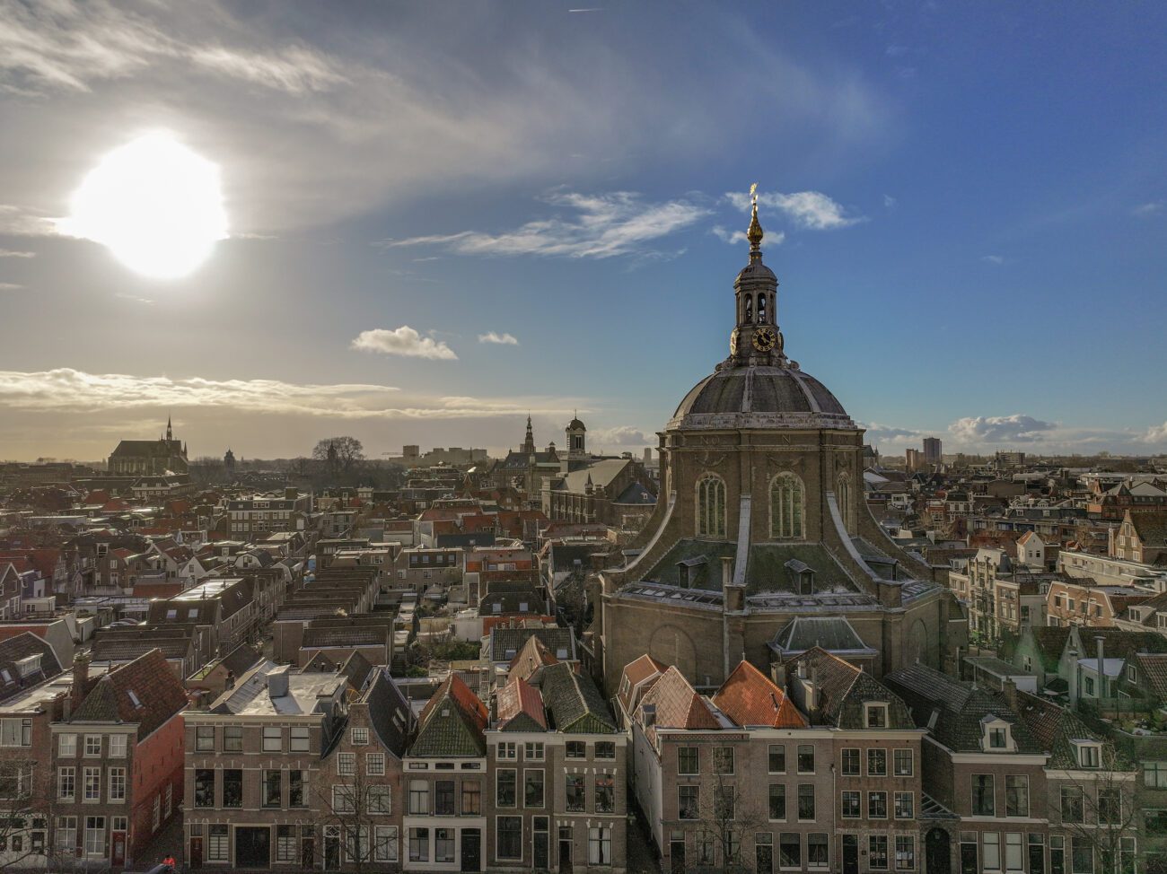 Een Zonnige Herfstdag Boven de Leidse Binnenstad: De Hartebrugkerk in de Hoofdrol